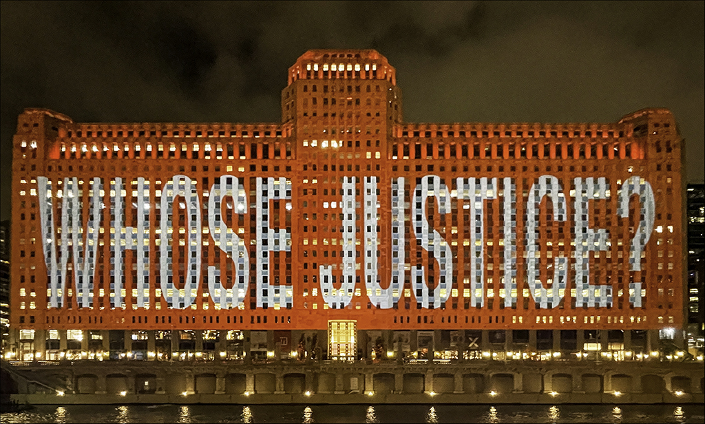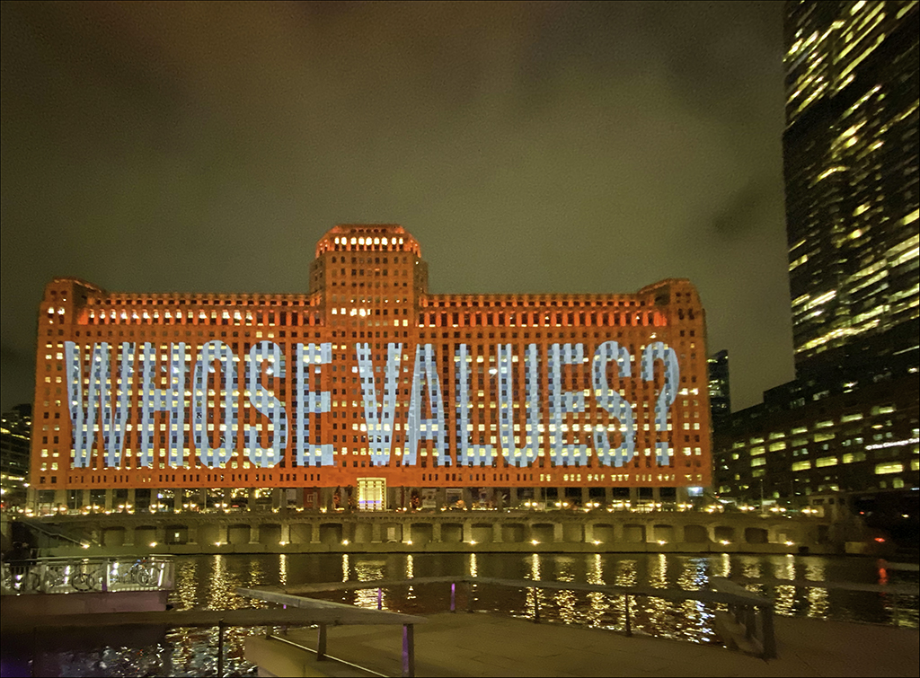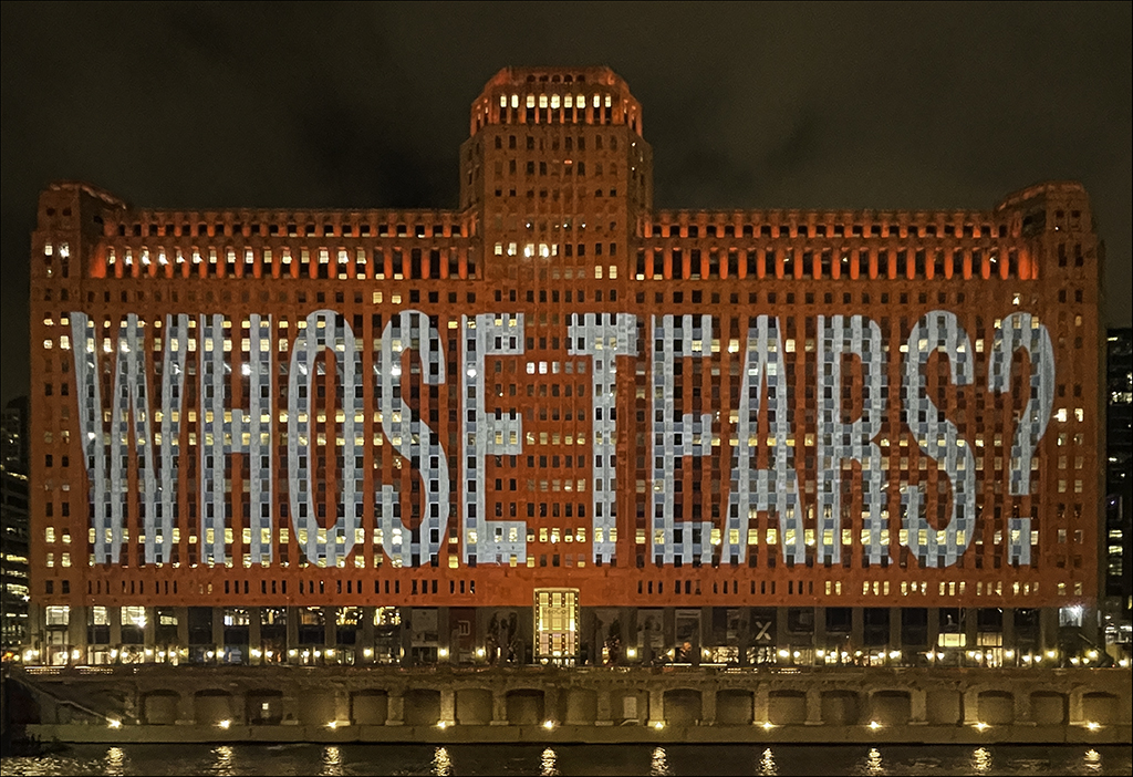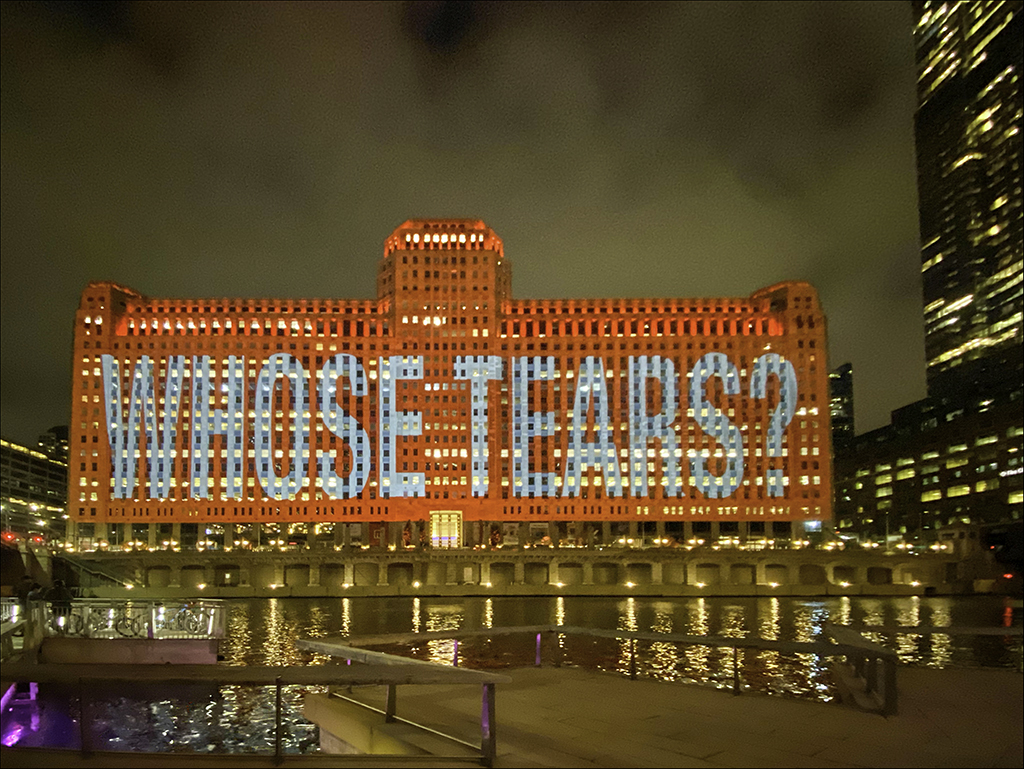 These projections on The Merchandise Mart, are part of the exhibition THINKING OF YOU. I MEAN ME. I MEAN YOU at The Art Institute of Chicago, on view through January 24, 2022. The projections run through November 25, 2021.