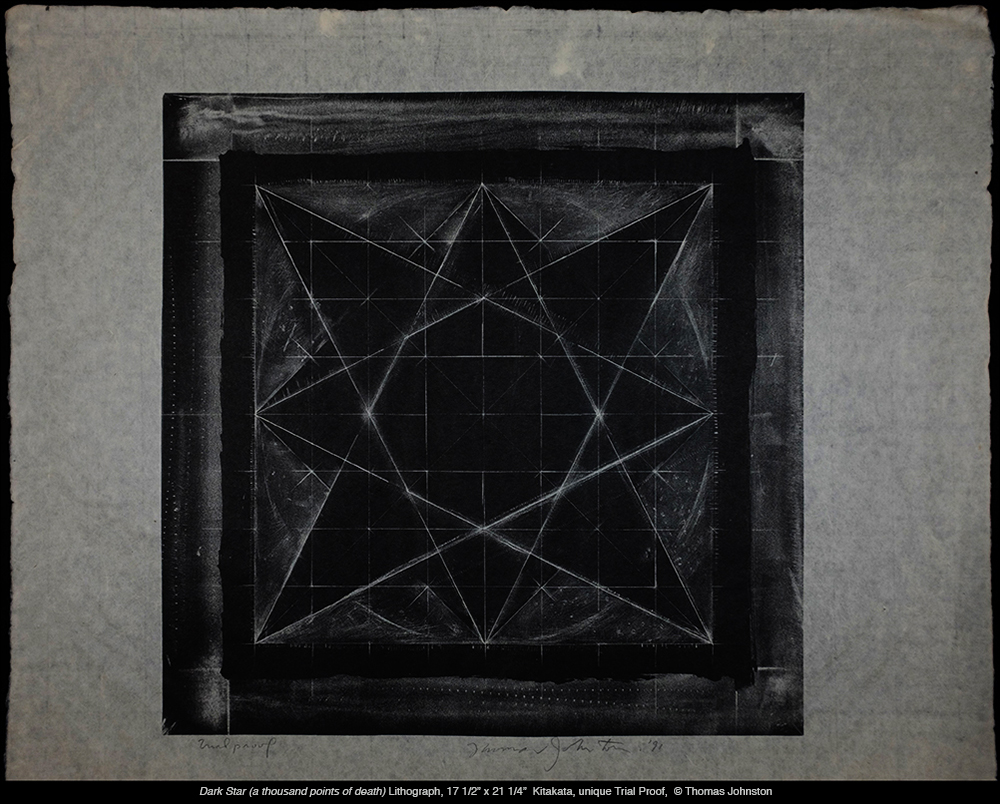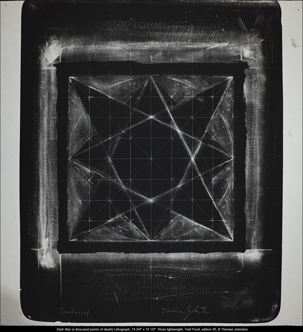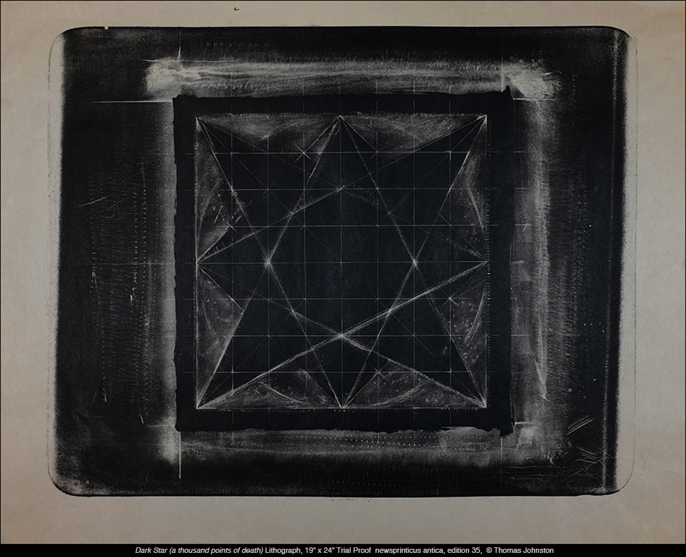 Dark Star – lithograph, hand-drawn, on stone, that began as an investigation of opposites using black and white, pairing order and chance, a structured network in contrast with coarse and smooth textures emphasizing the grain of the stone. I approached the image using chiaroscuro, a manière noir method of drawing, creating light from dark. I used a variety of tools and materials – needles, blades, scraping implements, sandpaper, bronze wool, and solvent. After laying down a double base of asphaltum, rubbed into and buffed on the surface of the stone, I incised the underlying structural grid into that smooth darkness. Then I subtracted further from the dark, and combined this with re-working through additions, physical and chemical, proofing, counter-etching, re-etching, and using gum stencils – thus taking advantage of the plasticity of the lithographic processes.