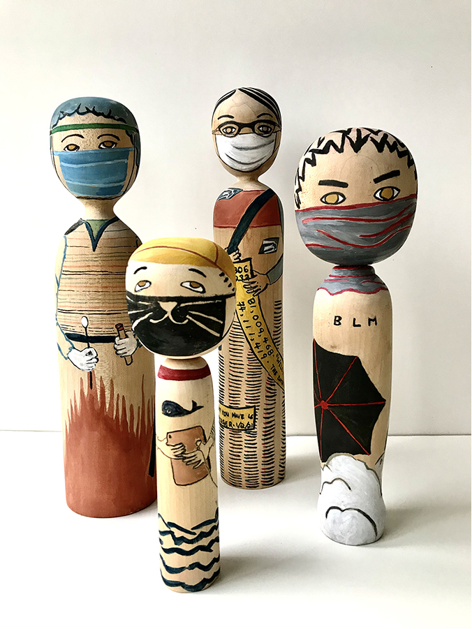 When, about a month after we had our second vaccination shot, and the country was beginning to see advances in defeating the pandemic, we ventured out, first, to La Conner, Wa. which was in the early stages of emerging from a year of isolation. We went north to see a show by Louise Kikuchi in nearby Edison; in addition to her beautiful Sumi-e paintings she was showing a group of traditional Kokeshi dolls she painted to reflect events of January 6, 2021. The Kokeshi wore masks and the pedestals were arranged following social distancing guidelines.