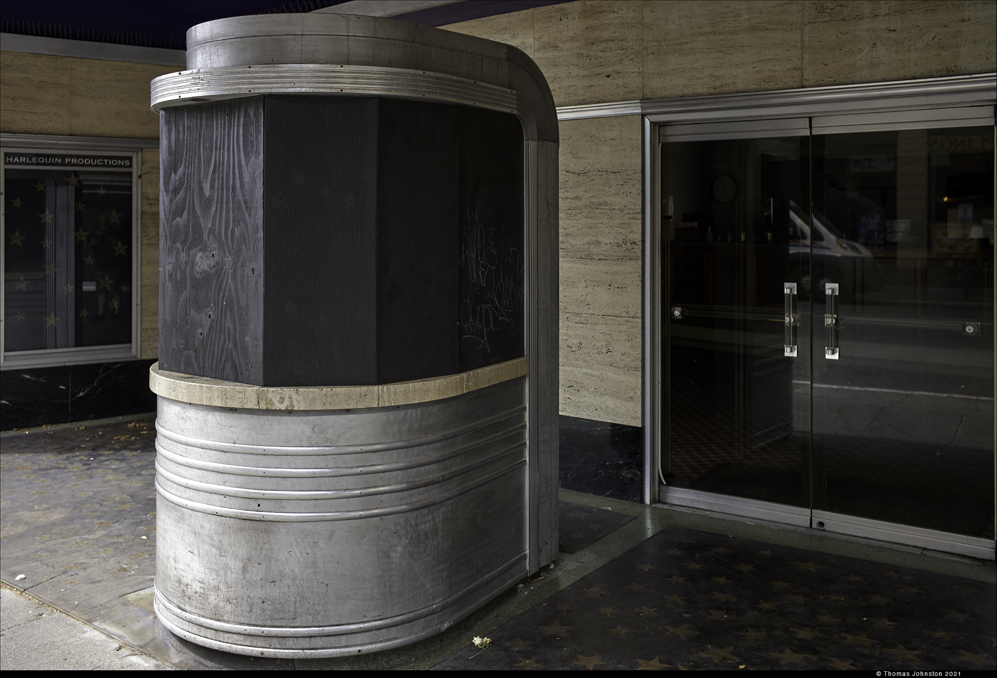 - Boarded-up Ticket Booth – August 2021 Former State Street Movie Theater Current Home of Harlequin Productions
