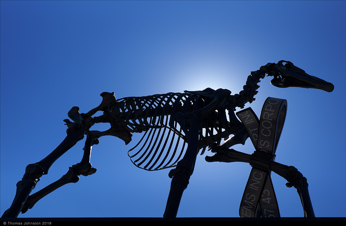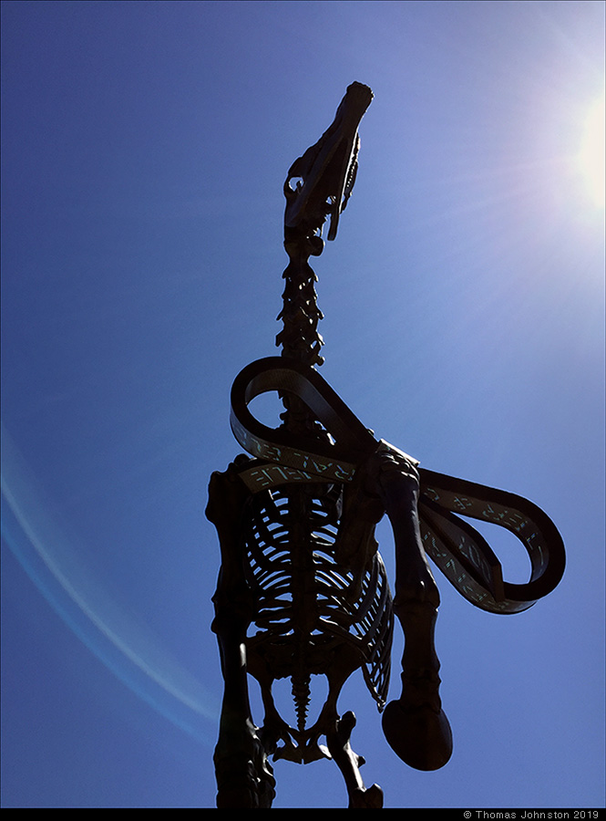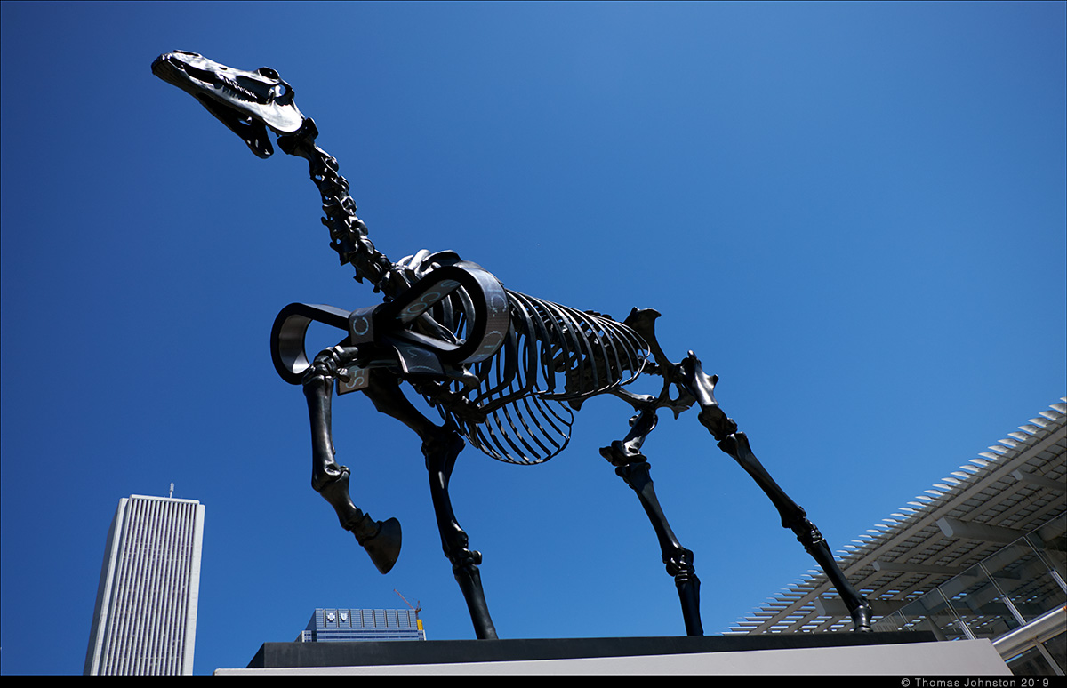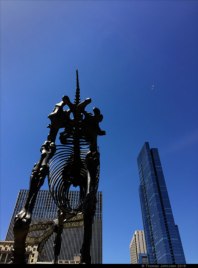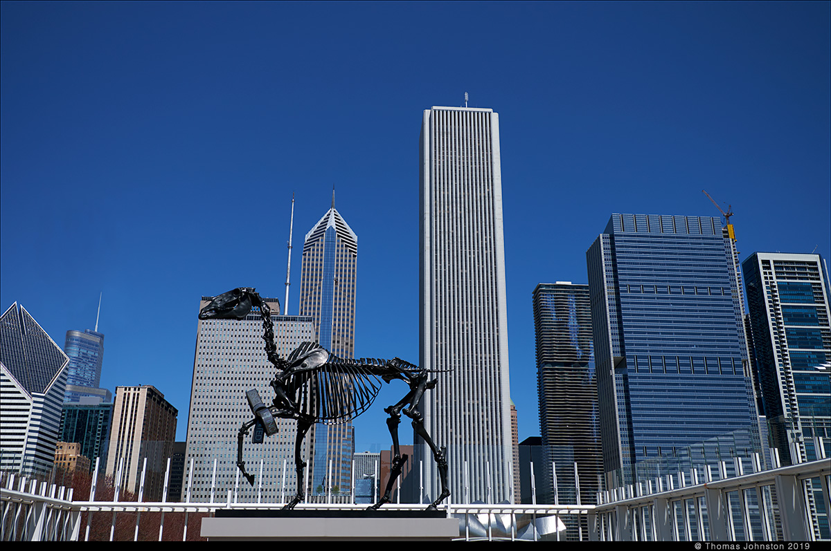 On one of our walks we went to Millennium Park to see Anish Kapoor’s Cloud Gate and Frank Gehry’s band shell in brilliant sunlight, and approached the Art Institute via the footbridge that takes you to the courtyard terrace and restaurant on the top floor of the modern wing, designed by Renzo Piano some ten years ago. This is a convenient – and beautiful – way to approach the exhibitions in this roof top space as they are free and open to the public, not in with the part of the museum that requires tickets. The sculpture by Hans Haacke, Gift Horse is sited perfectly on the terrace with the skyline as a backdrop, amplifying the concept and content of this art work. Gift Horse was originally commissioned for the city of London, to be temporarily placed on the empty plinth in Trafalgar Square. For this monumental bronze sculpture, Haacke drew inspiration from a George Stubbs engraving of a horse skeleton. From a distance, the bow around the horse’s leg looks like gift-wrapping or tying up a break – a closer view reveals that it is pulsing with a live LED readout of the stock market. This work continues the artist’s investigation and critique of systems of art, power, and wealth.