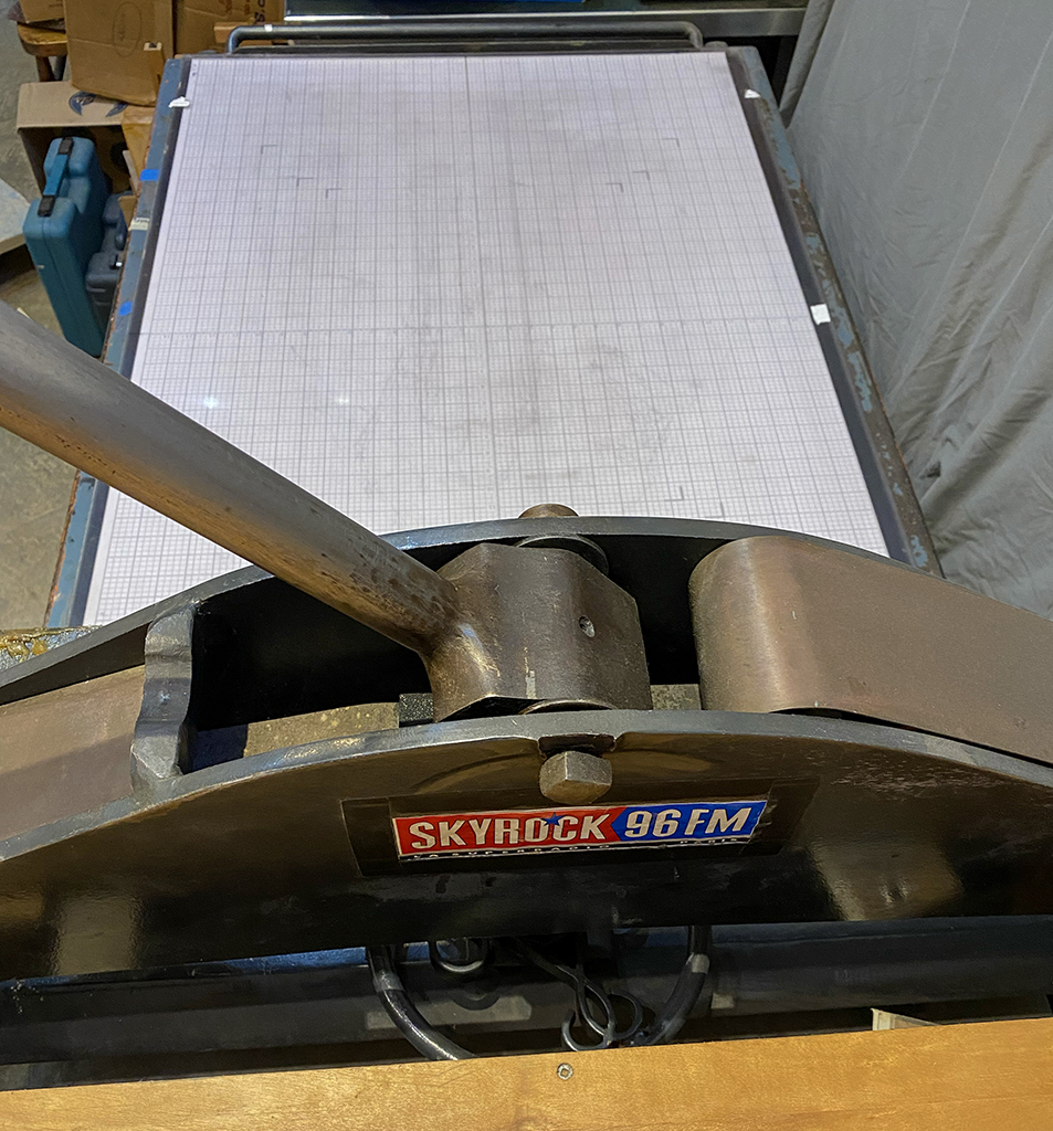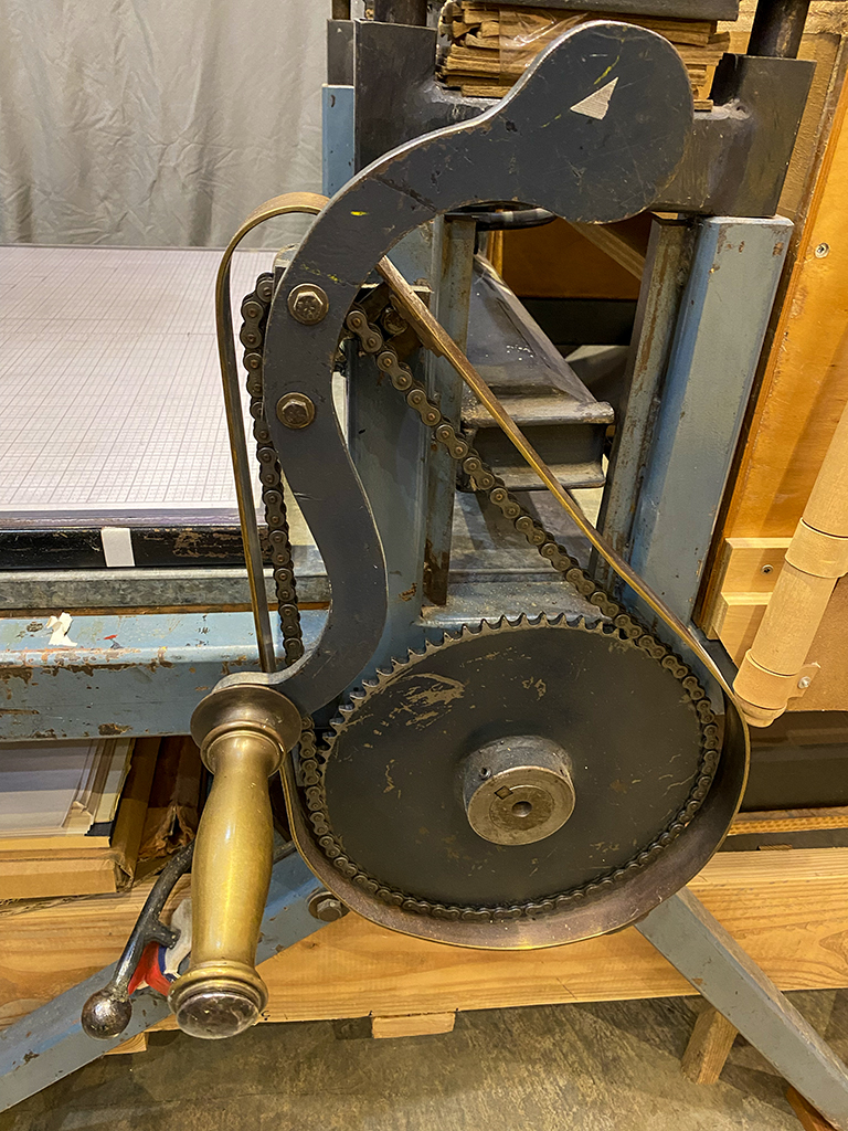 Includes false bed, scraper bars, tympan, covered shelf, and lower shelving/support for hydraulic lift for moving press in the studio.