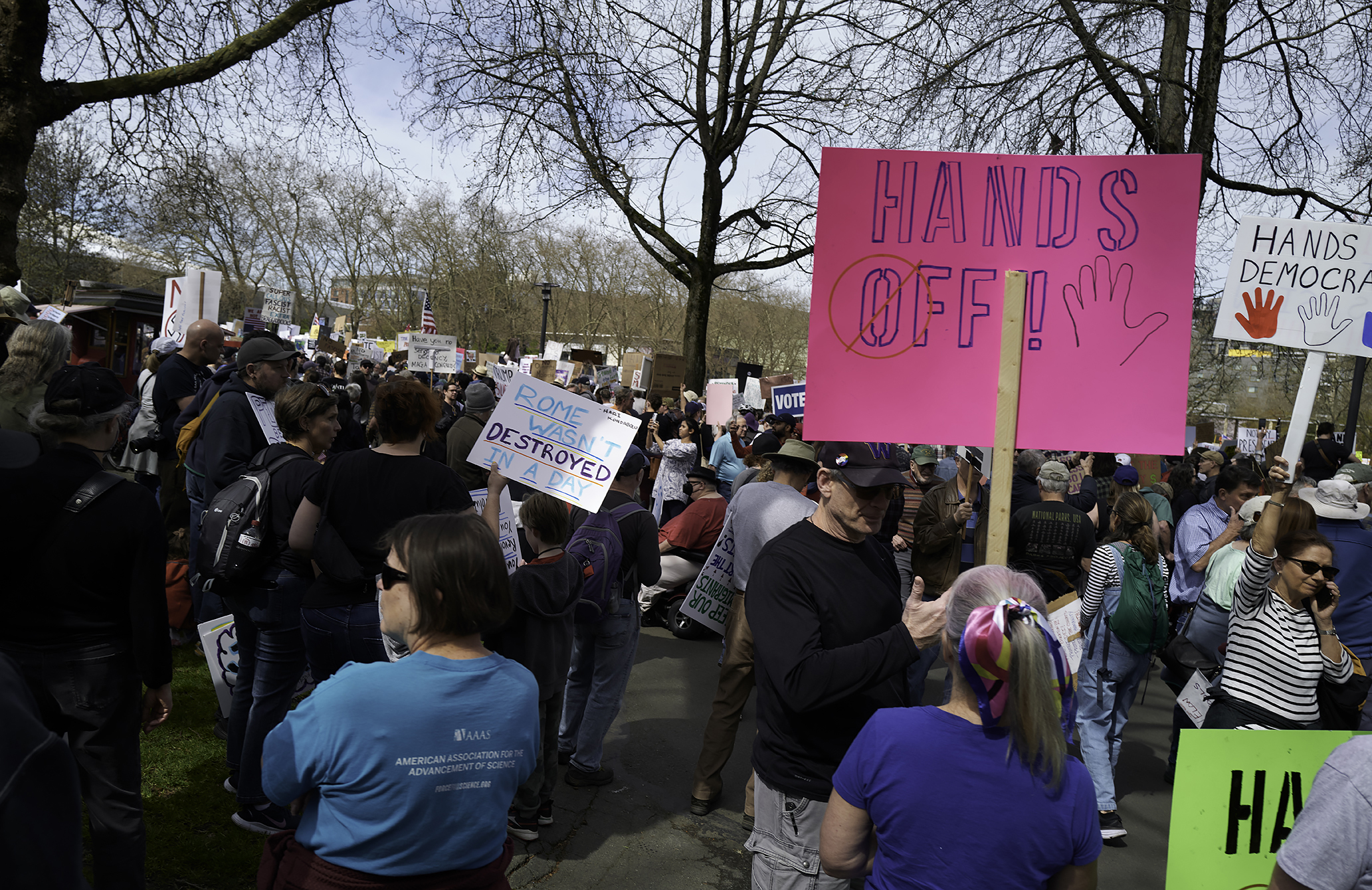 With their popularity over these many years, on some days the crowds were so intense that just navigating from one venue to another was time consuming. The Hands Off turnout reminded me of the crowd sizes of some of those previous years. One difference is that the speaker’s podium was the main event, with no events scheduled in the indoor arenas. I haven’t seen an official number of attendees for this rally which is said to have ranged between 14,000 and 40,000. Whatever the number, Seattle was part of the 5.2 million people who showed up to peacefully protest at Hands Off rallies across the nation and around the world.