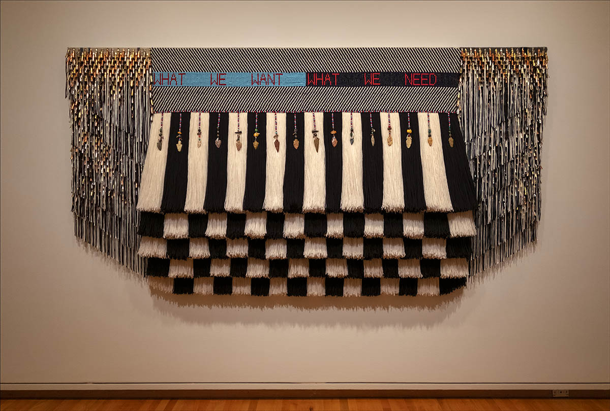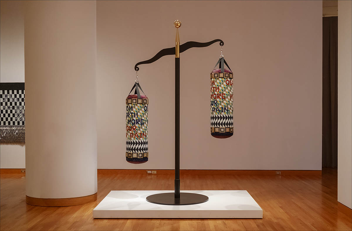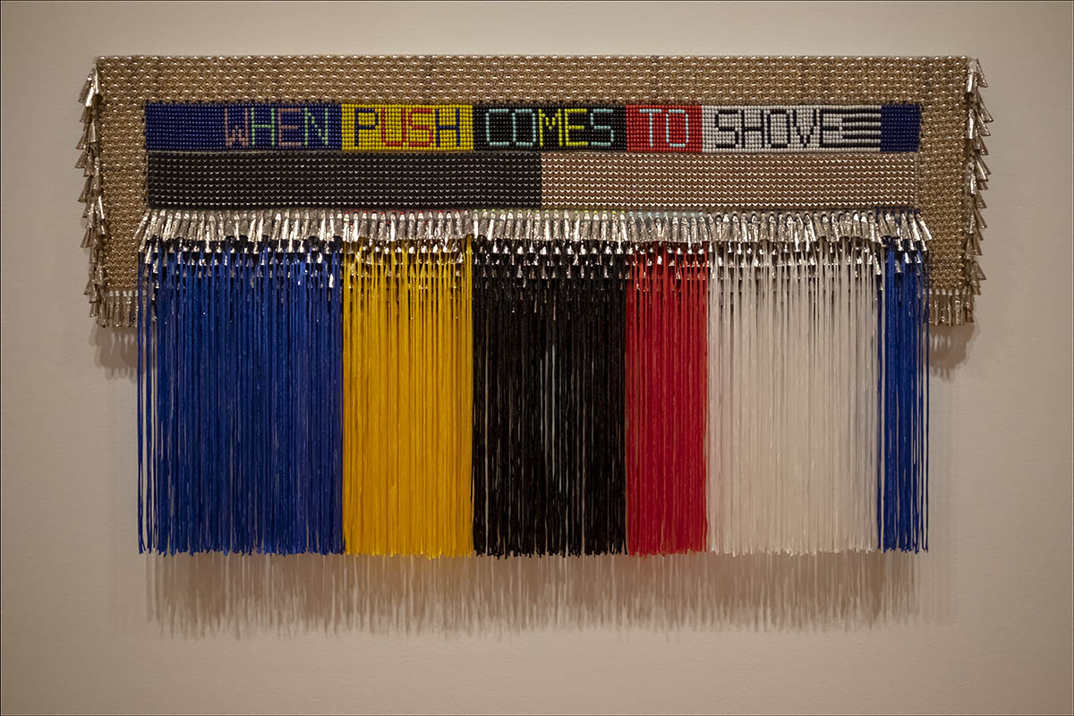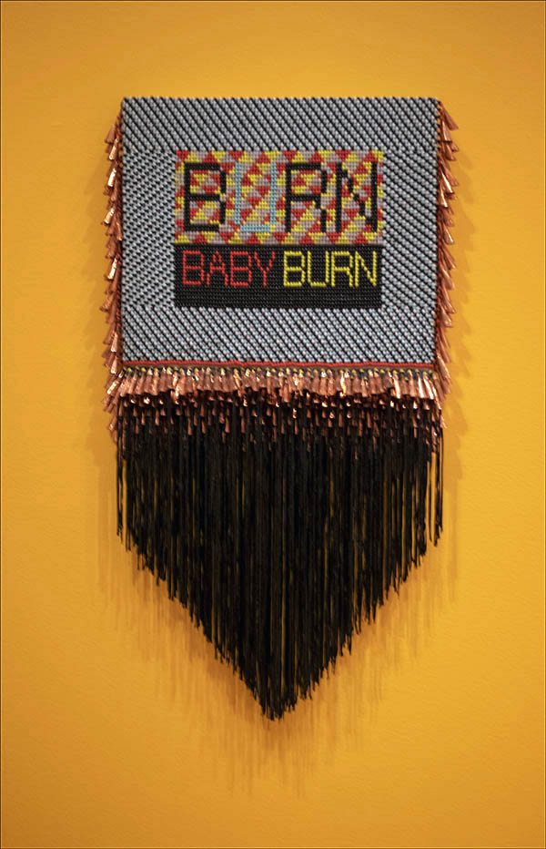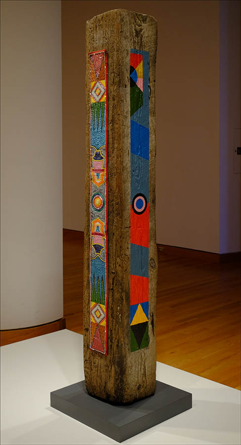 - Beaded Column, 2012 Acrylic Paint on Recycled Construction Barrier with Beadwork by Whitney Minthorn