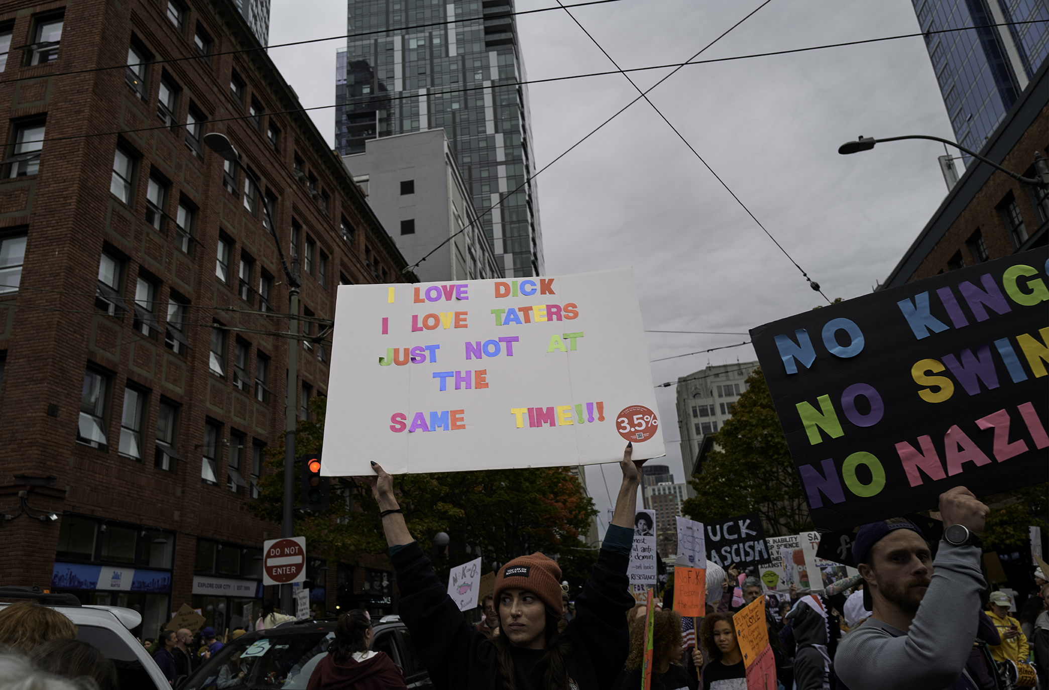 We joined the Seattle march, from the Seattle Center, along 5th Avenue under the Monorail, to the Pike Place Market, well over a mile of people, estimated to be 90,000, many on foot, some with assistance, multi-generational families, infants, parents, grandparents, teenagers to octo/nonageneraions. Individual home-made signs with unique messages all declared a love of country with the over riding message: No Kings!