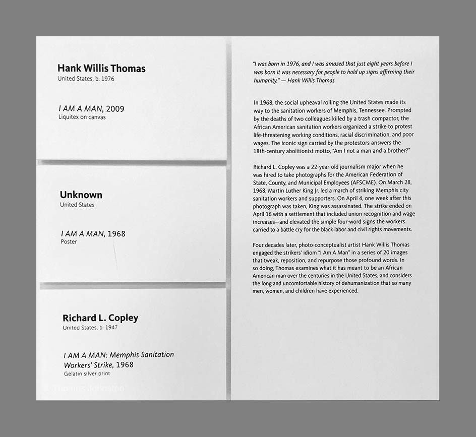 Also on view, in the lobby outside of the gallery, is a Kehinde Wiley portrait, and Hank Willis Thomas’ series I Am A Man, and Richard L. Copley’s photograph from the Memphis Sanitation Worker’s Strike of 1968. Meanwhile on the west coast, Portland Art Museum has a major exhibition of Thomas’ work through January 12, 2020.