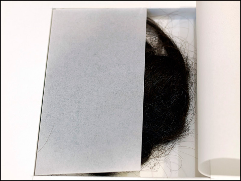 I selected the blackest hair, thinking to the future of black on black, ink stained strands of hair and what trails of ink they would depart to a page. When I got the bundle of hair to the studio and began to study it in preparation for a brush, I became fascinated with the mystery it contained. All I knew was where I had received it, but from whom it came, I had not a clue. The strangeness of having something so personal yet anonymous became more mysterious the more time I studied it. I unraveled it in preparation for a brush, or what could be several brushes as indeed they were long strands of silky black hair. The hair was delicate and would be more suitable to using with water-based materials; and with this delicacy and intimacy, my curiosity about who had given this up, what had prompted their transformation, began transforming my initial idea. Rather than turning it into a depersonalized implement, I decided to give it a new life in the form of a special book, with a secret space, cut away into the interior of a black book, a safe place, hidden deep within a pocket specially designed to protect and preserve, yet surprise a viewer who may one day open this book in a library, with curiosity, delight, and mystery.