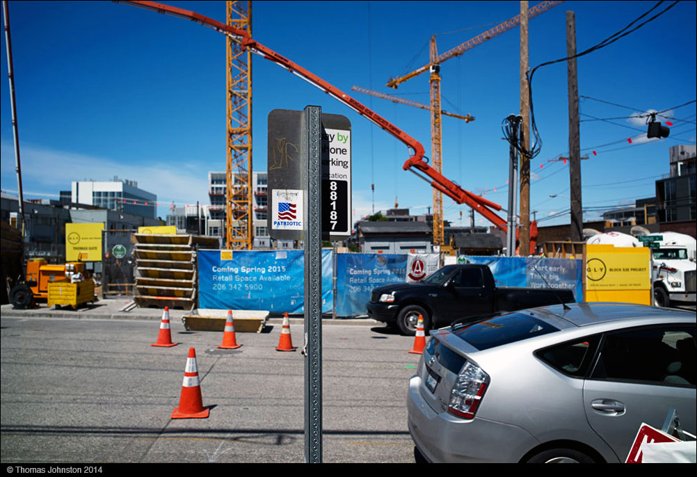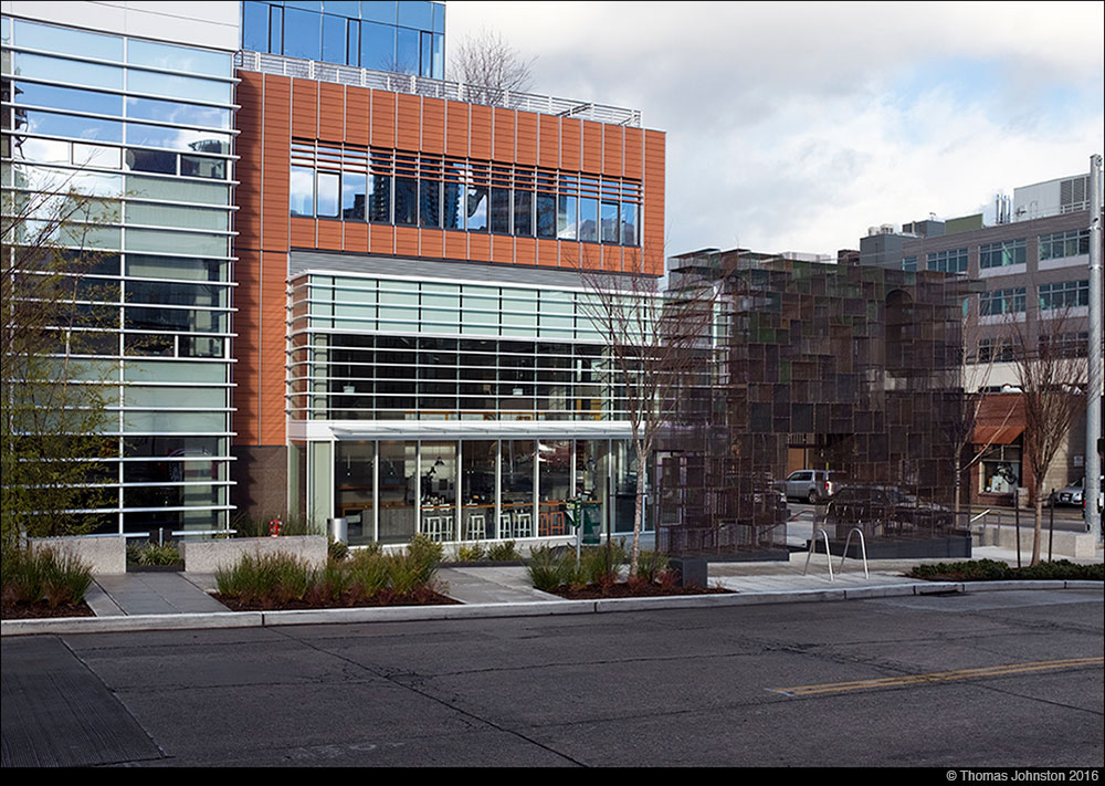 I’ve been in this Seattle neighborhood many times over the years, sometimes just passing through on my way to other places in the city, sometimes exploring, by car and on foot, walking, with camera. For many years it was a quiet out-of-the-way neighborhood on the northern edge of the downtown core, where, until recently, it was a challenge to find a place for a decent lunch or, if one can imagine in Seattle, a good espresso. Still located in this neighborhood is Seattle’s premier camera store; there was a professional photo lab for many years, and until recently one of my favorite exhibition spaces Wright Exhibition Space. This neighborhood lies at the north end of the main downtown area, bordered on the east by I-5, on the west by Hwy 99, and on the north by Lake Union, thus it is now referred to as South Lake Union. I’ve seen this neighborhood transform from an agglomeration of small industry and manufacturing, specialty retail shops, artist’s lofts and alternative spaces, into a vital retail neighborhood, with major corporate headquarters and research facilities.