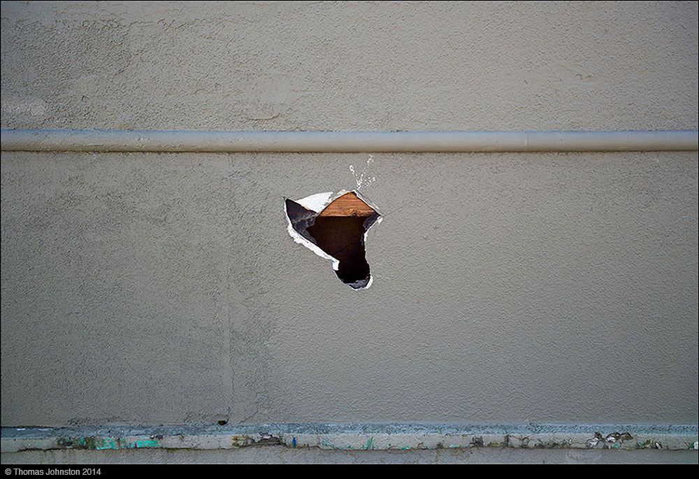 The four pictures included here document the change of a specific place, a wide shot and a close-up, one of each, made some 18 months apart. I was inspired to take the above pictures, and thought it would be interesting to compare the four images. I was certain that this new shape was related to the one in the earlier picture, and as I thought about the shape, the hole in the wall, most likely the result of a construction accident, I wondered, why hadn’t it been patched, going on nearly two years? Perhaps this property will soon be razed as part of the urban renewal of this neighborhood.
