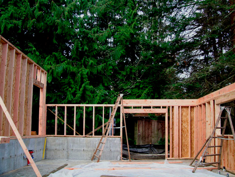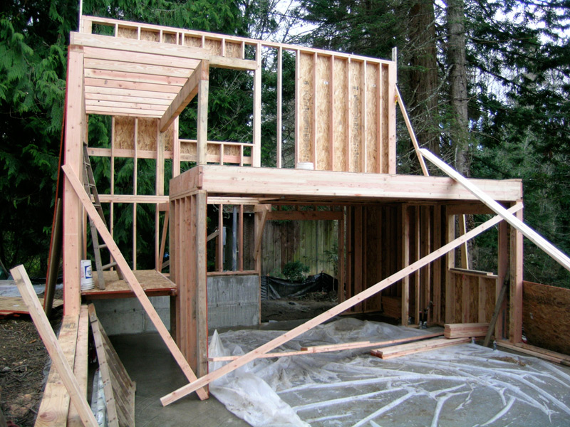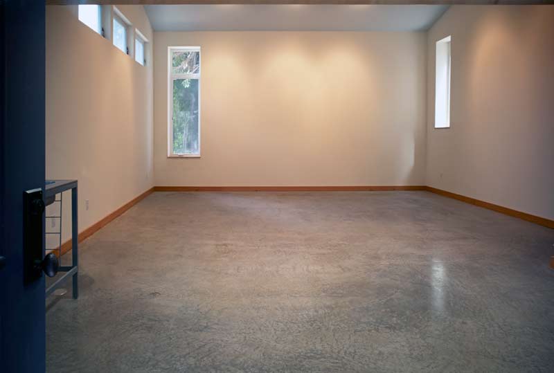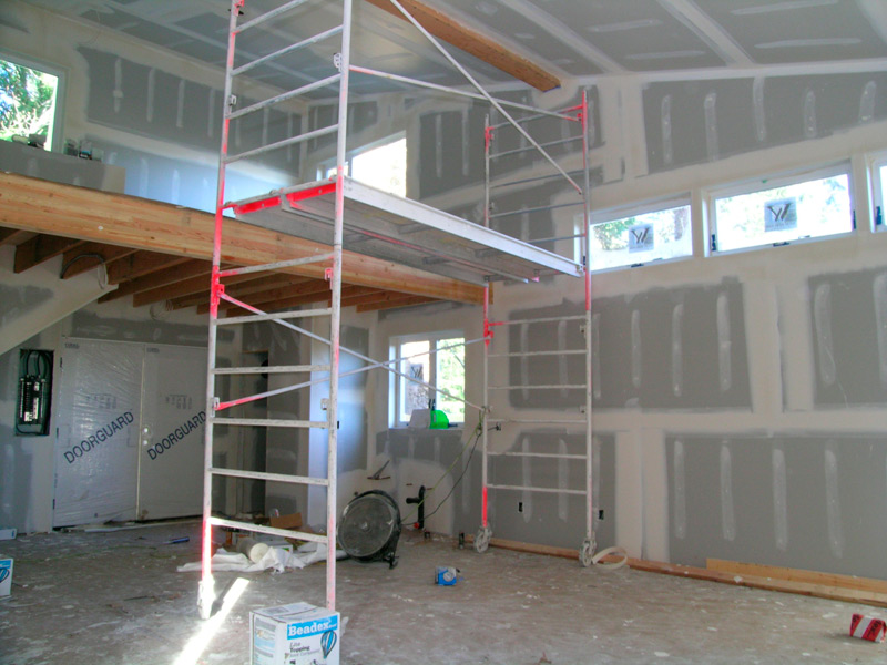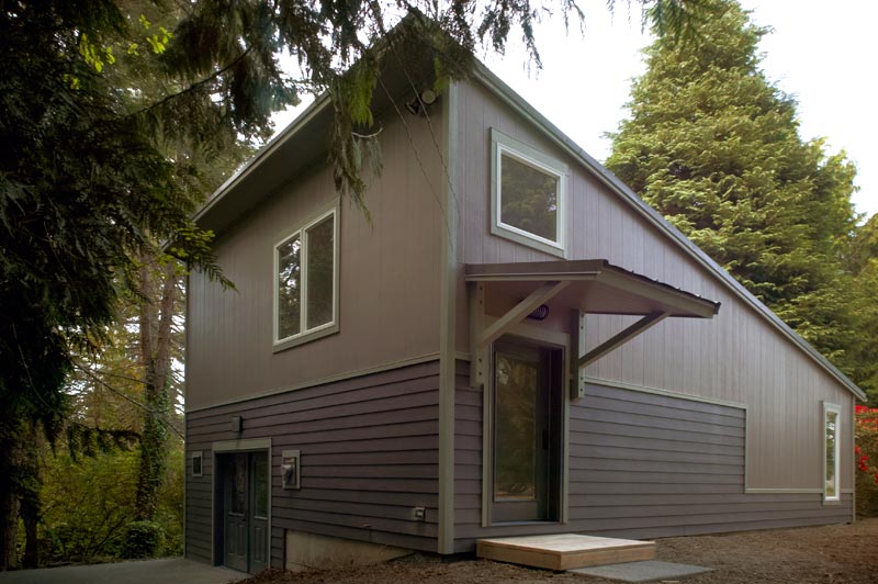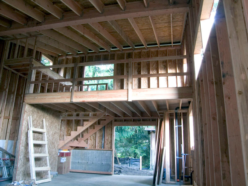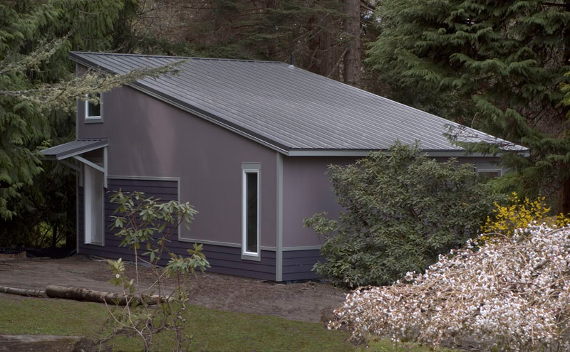 A few years ago we relocated and found a house we liked, and looking to that dream, there was room to build a studio on the property. I met Bob Leverich, an artist whose work I admired, is a trained architect, and interested in sustainable design. We talked, viewed the site, reviewed some of his previous buildings; he drew, and we began meeting regularly, defining my needs within the space and budget. The basics: do as little to disrupt the environment, build green, be energy-efficient, have running water, radiant heated slab, metal roof, north light windows, storage loft. Plans were drawn, models built, engineered, permits approved, details refined. Building the studio was underway; ground was broken on a wet day in December! Details were modified and refined during the process. Nine months after our initial meetings the building met the final inspection and I began moving in at the beginning of summer.