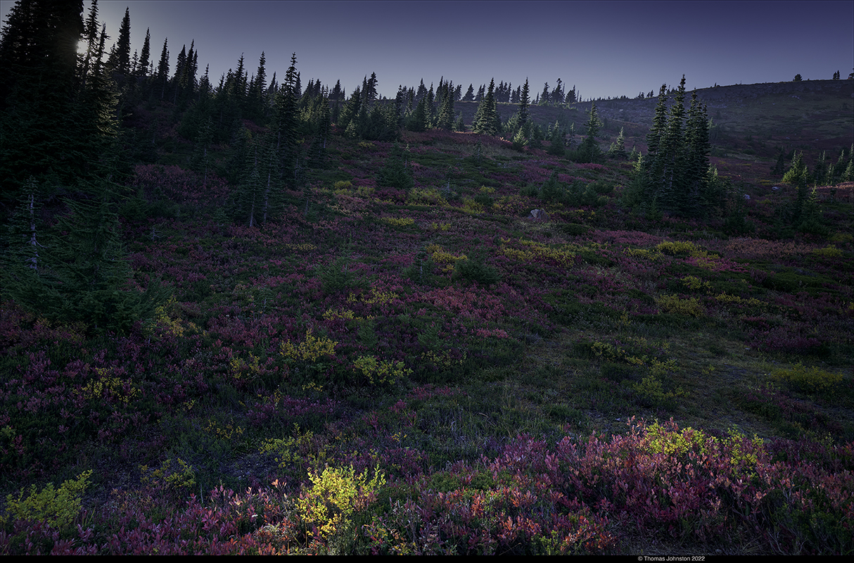 The eastern edge of the meadow caught the final rays as the sun dropped below the crest of the ridge filling the meadow with shade. The Nisqually Glacier overlook provides a beautiful view of the mountain, the many waterfalls flowing into the glacial moraine, and the glacier itself, the origin of the Nisqually River. Untold numbers of people have experienced the beauty of nature from these viewpoints at different times and seasons, spanning the centuries. The view presented the day we were there has already been transformed with the arrival of snowfall.