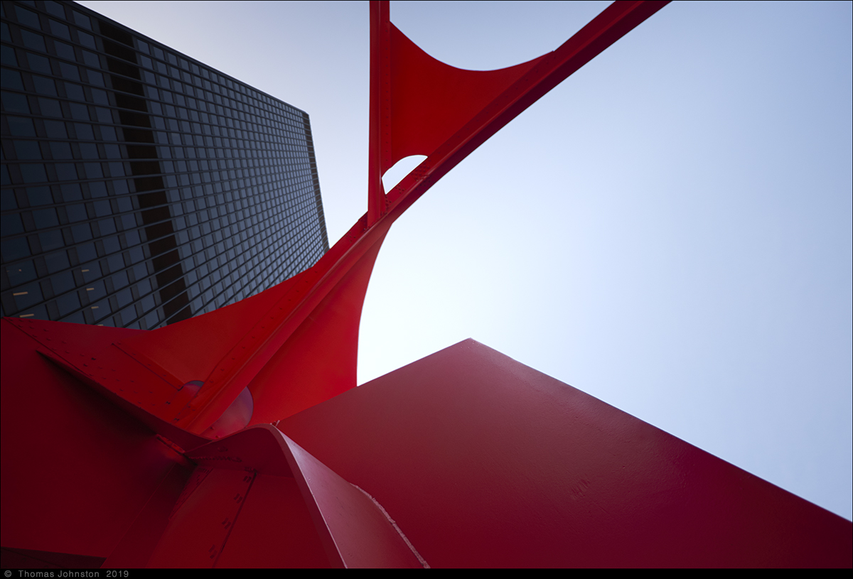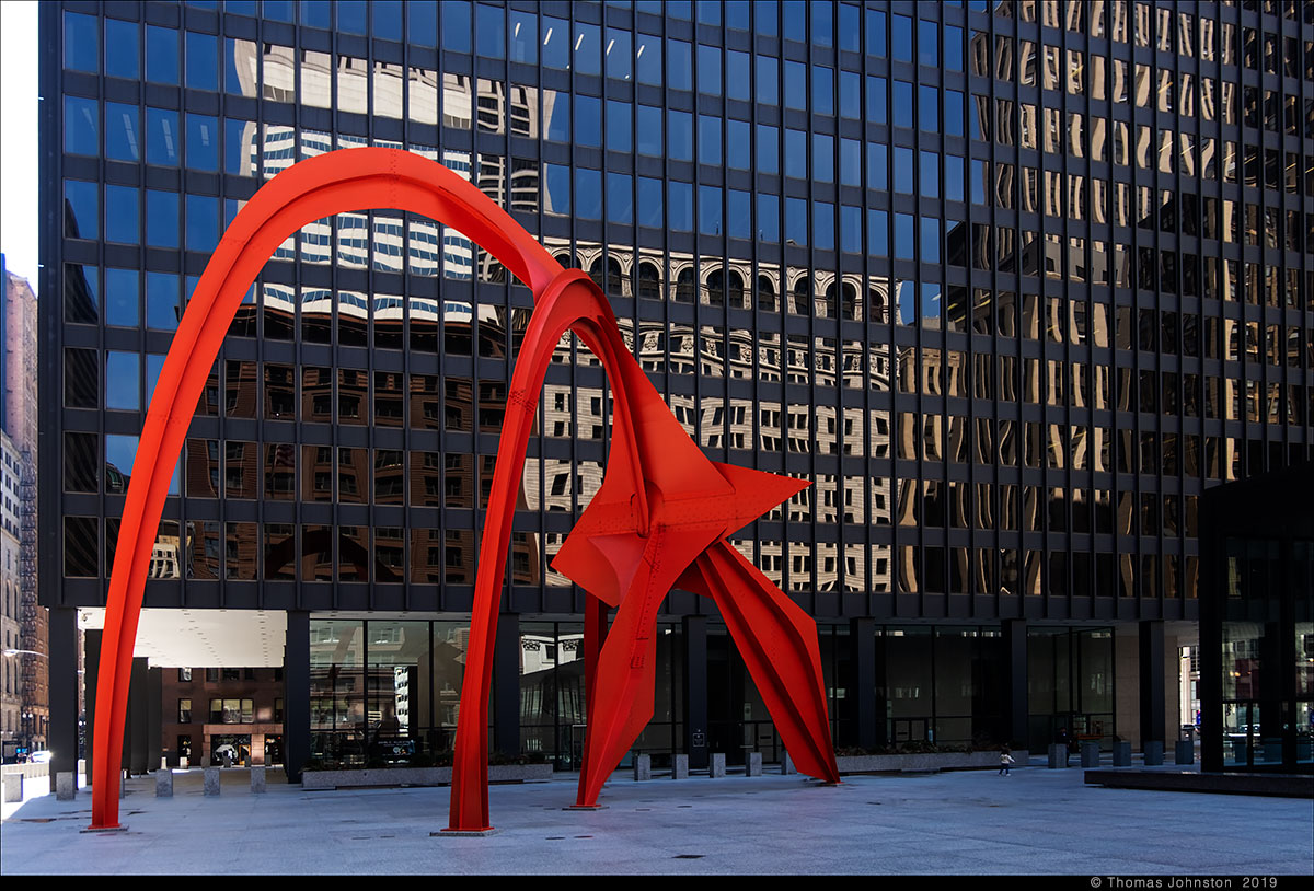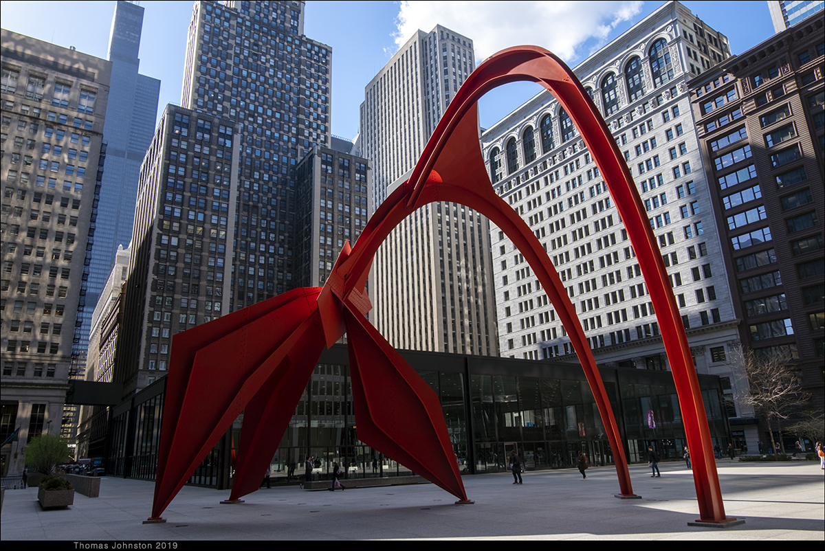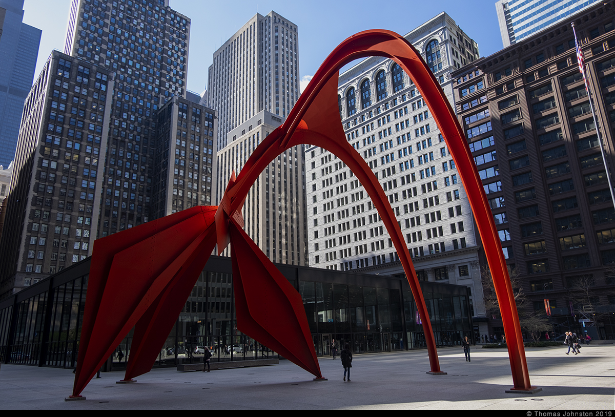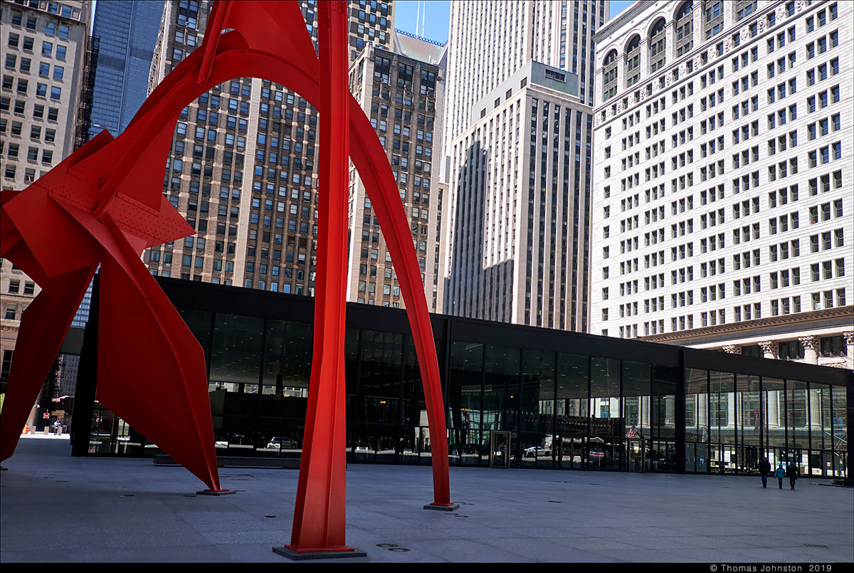 During one of our recent visits to the Art institute, we left via the exit near Alexander Calder’s model for Flamingo, as we planned to walk along the lake to see Mark di Suvero’s sculpture that we had seen a few days earlier. Calder’s Flamingo is the model for the outdoor sculpture on the Federal Plaza campus, designed by Mies Van Der Rohe. I’m always reminded of the day some years ago, exploring the museum with family, Steve, Hilary, and Spencer, when after a few hours we came upon the model for Flamingo, and then ten-year-old Spencer exclaimed, “Finally, something cool!” And I thought to myself, a young man with a good eye.