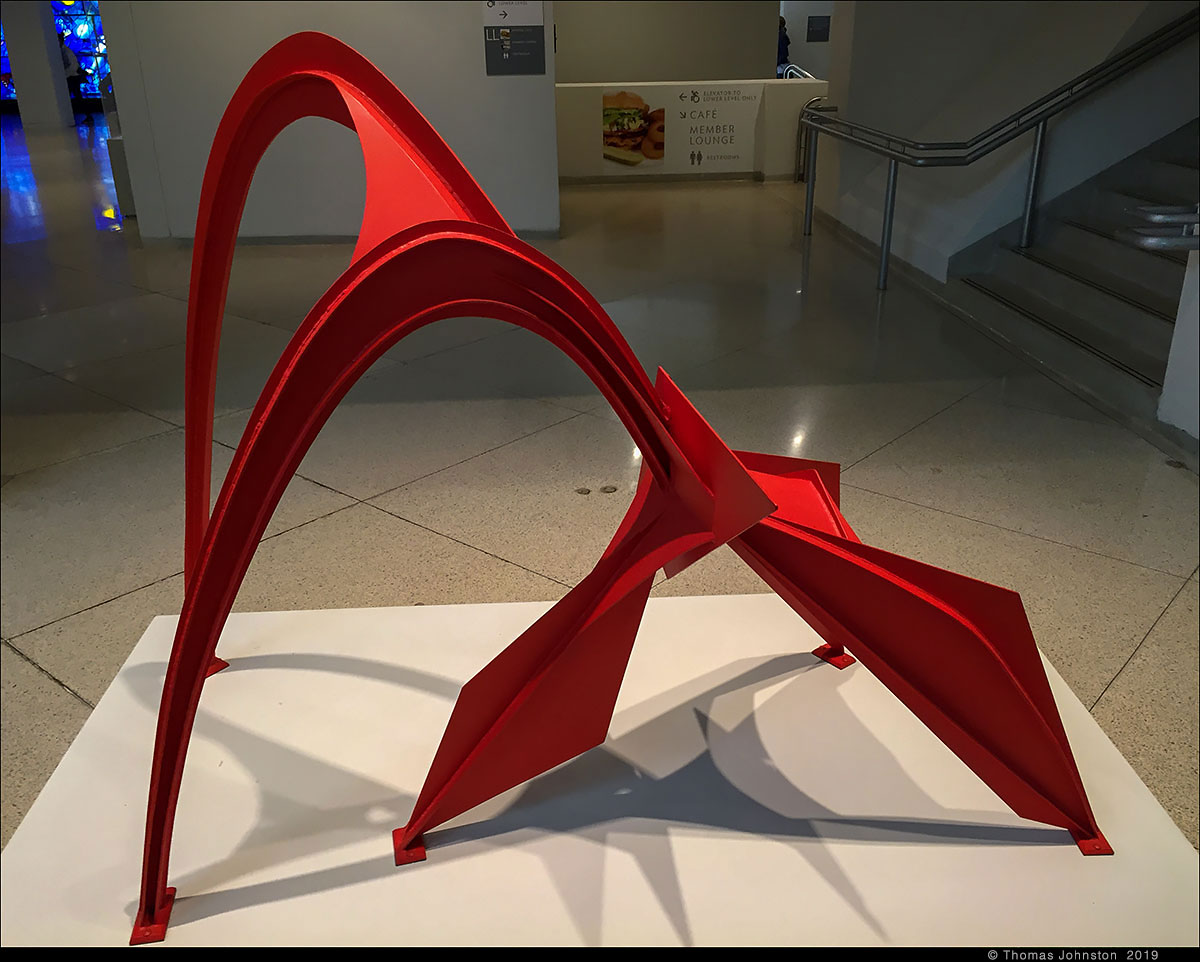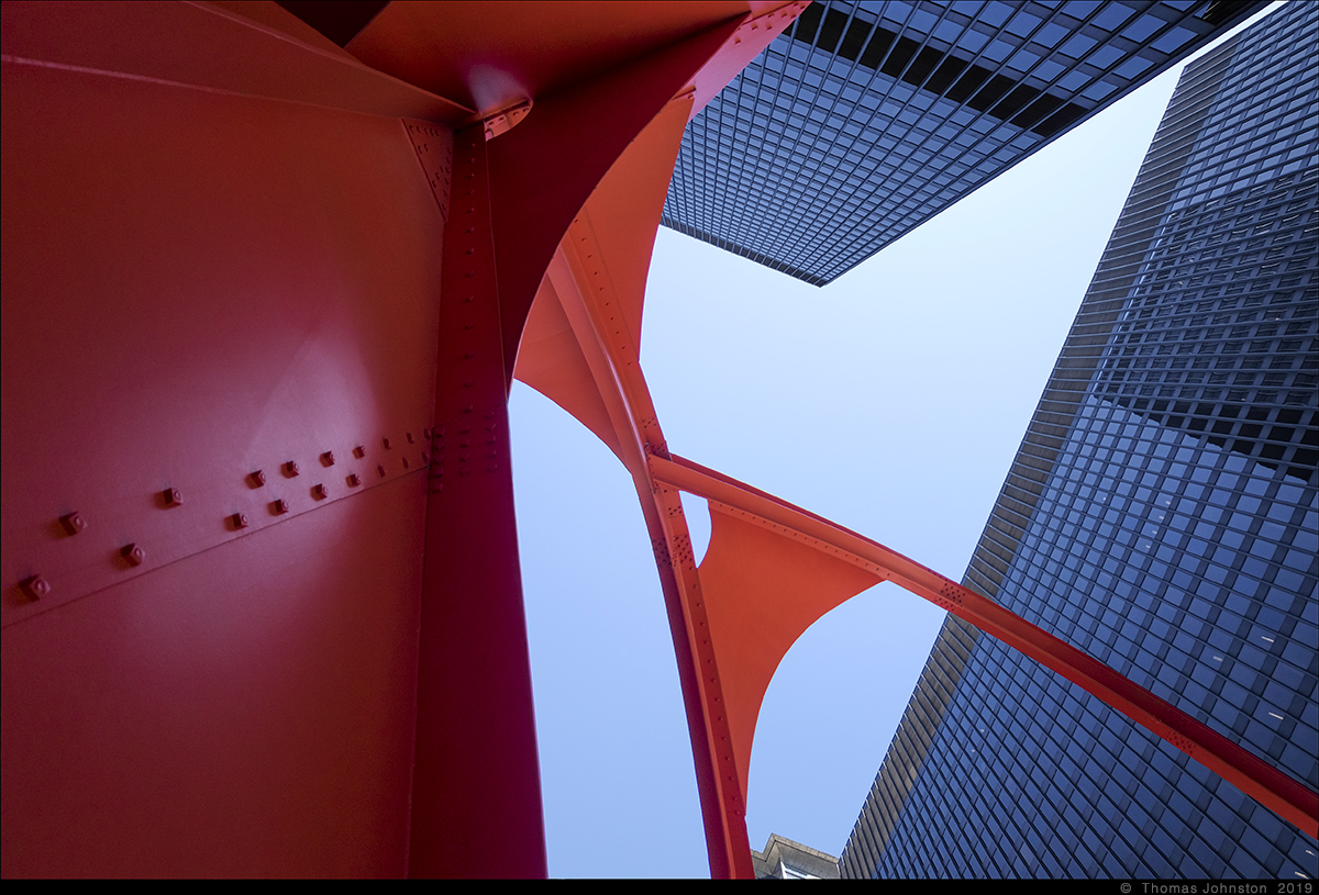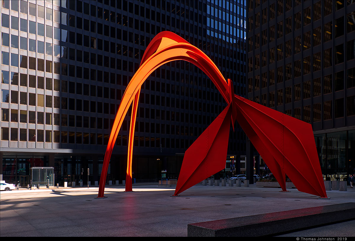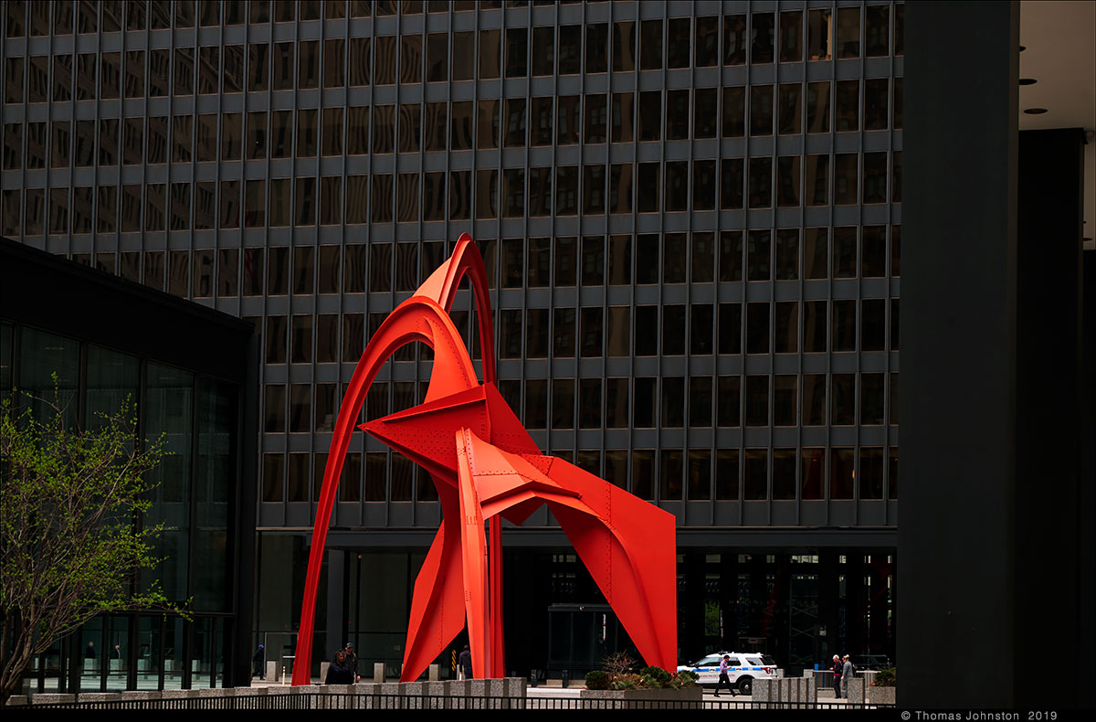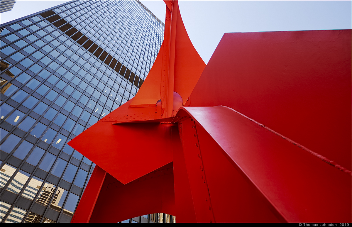 During one of our recent visits to the Art institute, we left via the exit near Alexander Calder’s model for Flamingo, as we planned to walk along the lake to see Mark di Suvero’s sculpture that we had seen a few days earlier. Calder’s Flamingo is the model for the outdoor sculpture on the Federal Plaza campus, designed by Mies Van Der Rohe. I’m always reminded of the day some years ago, exploring the museum with family, Steve, Hilary, and Spencer, when after a few hours we came upon the model for Flamingo, and then ten-year-old Spencer exclaimed, “Finally, something cool!” And I thought to myself, a young man with a good eye.