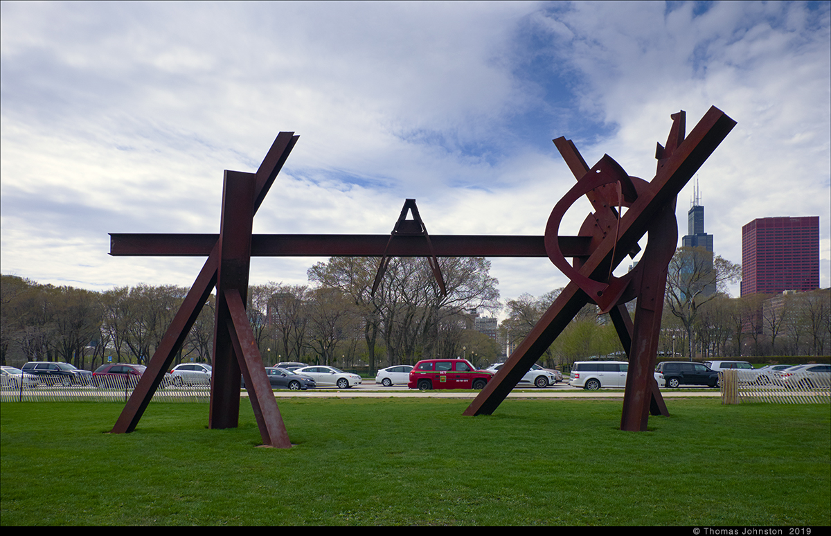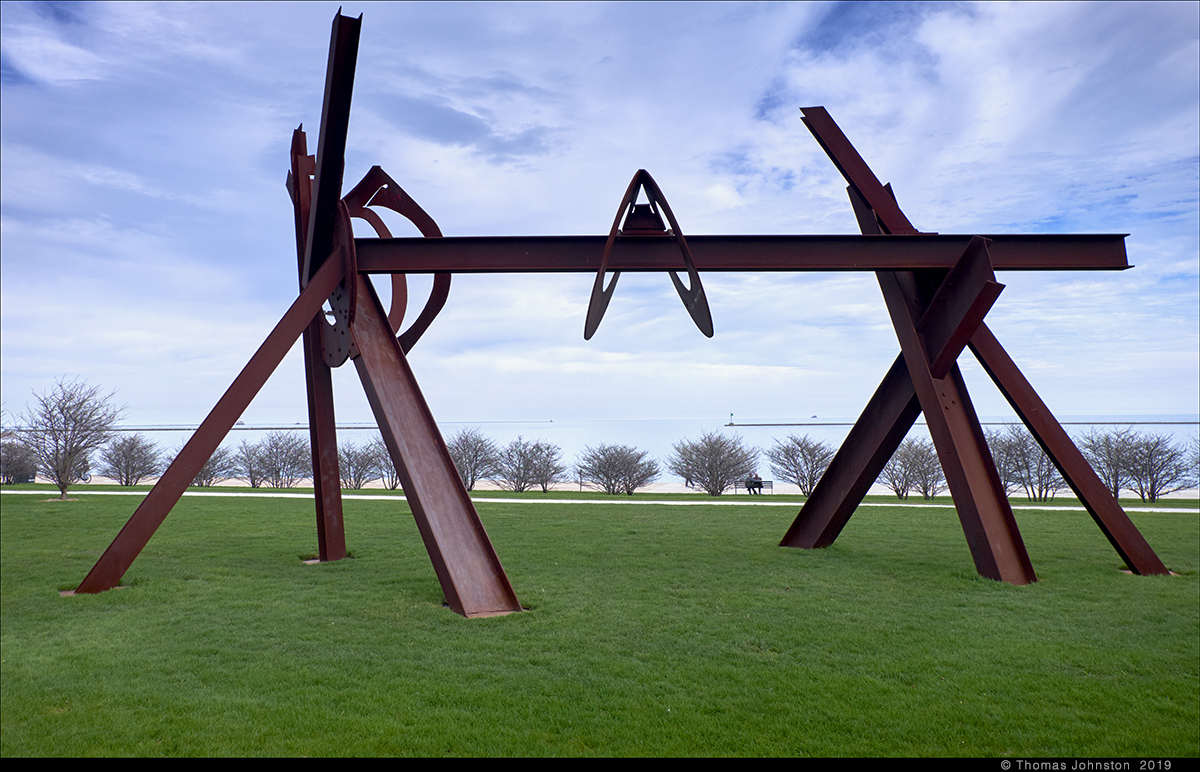 During this Chicago trip, we made several visits to di Suvero’s Magma and Calder’s Flamingo as we walked in the city. Seeing these two works, over several days, in different light, we were reminded just how important and exciting it is to see art works in a variety of conditions, different times of day, in direct sun or diffused light, at night, and in different seasons, and in the case of Magma, in another location. It makes one realize just how complex and truly magnificent these works are. At times like these one comes to understand that these works transcend being an object or thing and become, in part, because of their beauty, intent, and scale, monumental experiences.