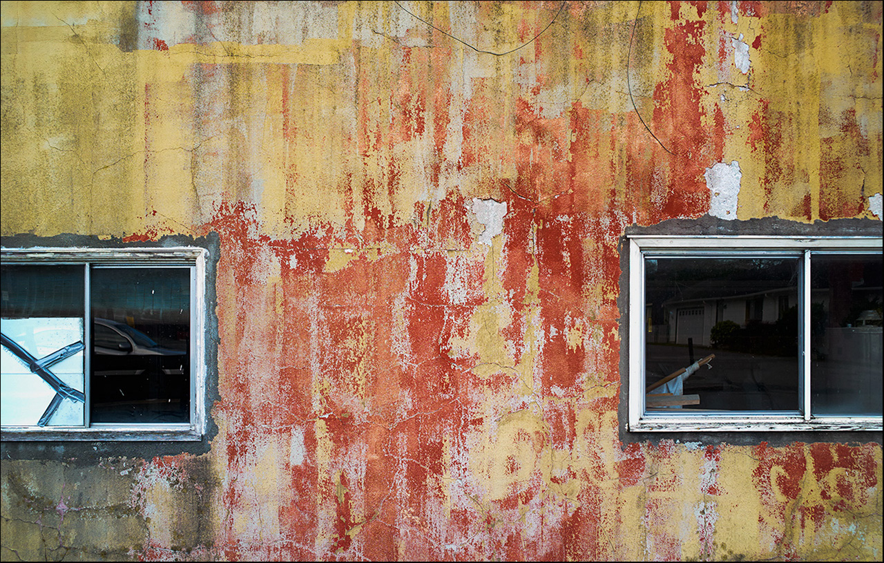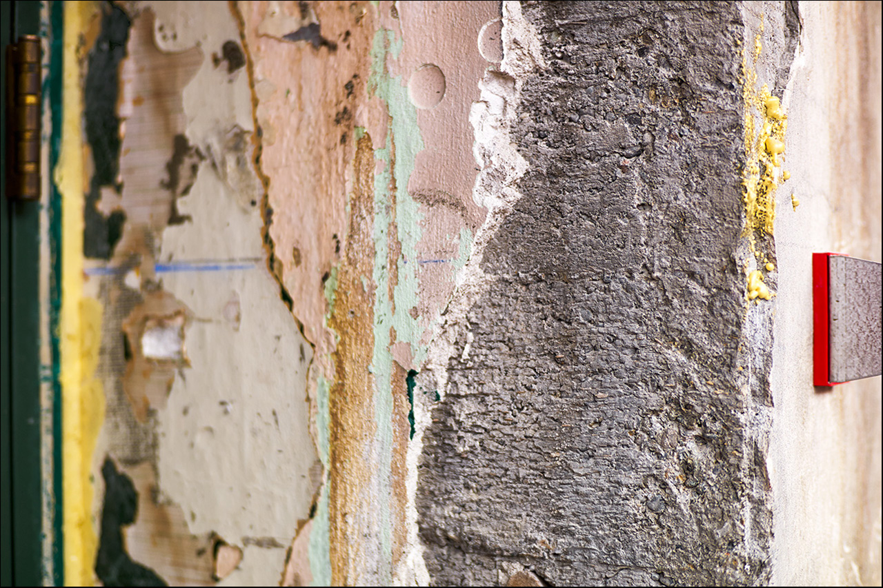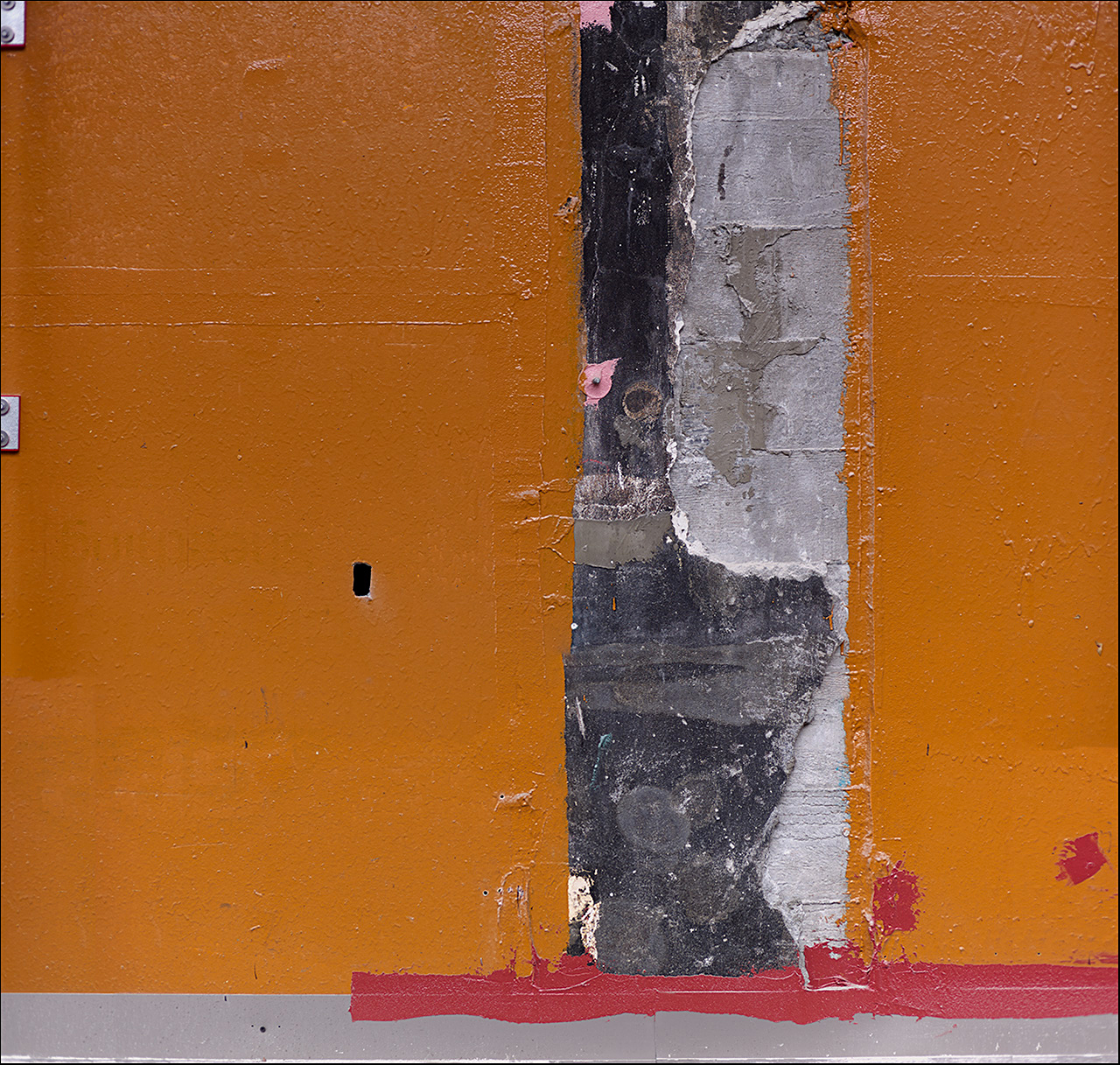 A few months ago I showed a selection of paintings and photographs together. Personally, I wanted to see how they read together, how they played off of each other. I wanted to share with the community the relationship between my canvasses and some of the images that were photographed within blocks of the gallery. Who knows how many people noticed that some of the images were from surfaces they walk by on a daily basis. And as we all know, things never remain the same – in this group of artworks, two of the surfaces that I photographed for the Palimpsest Series have been covered over by a new cladding system on an exterior remodel. Behind the new skin, the surfaces that caused me to stop and compose them within my rectangle of space, remain. They exist as moments in time, now hidden from view in the real world, only visible in my photographs.