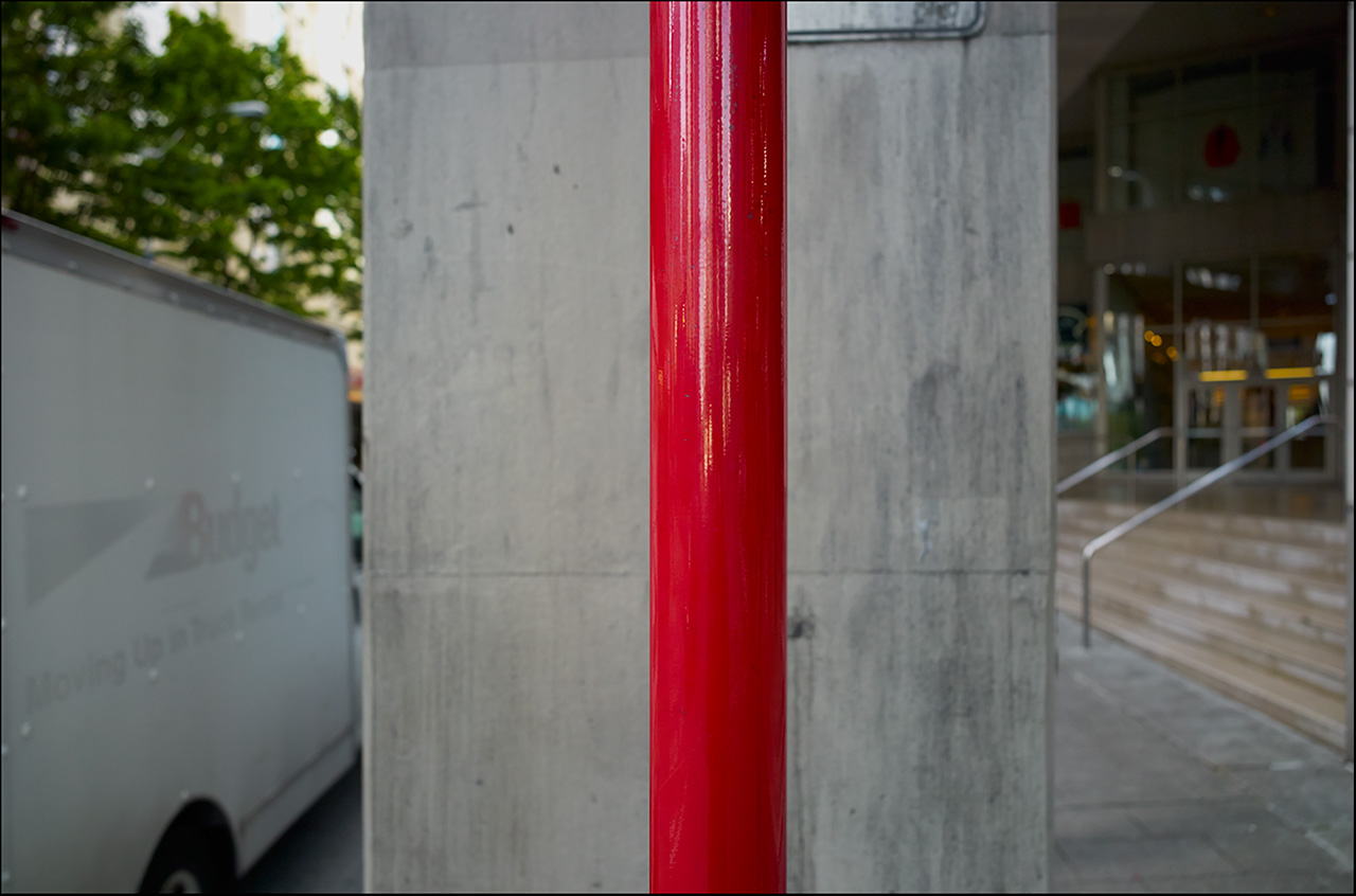 A few of the images are from a residency I did in the south of France in another century; the majority are from travels up and down the west coast, between Los Angeles and Seattle. They fall into categories I explore and return to time and again, questioning how and what we see, using the basic elements of all picture making: light, color, the beauty of black and white, time, arrangement and division of space, the tension between what is in focus, how flat and implied depth can be played against each other for emphasis. These formal concerns have remained a constant in my visual explorations whether in painting, printmaking, or photography. In my studio practice I use the medium I work with to best present what is required for specific images; while there are crossovers in how I compose, the photographs are made as photographs unto themselves. Exteriors tend toward exploration of surfaces: flat, textured, and layered within the urban environment. Interiors explore volumetric relationships, contained spaces of light and dark.