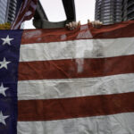 My usual approach is to document the action as a participant, marching in and with others. It was an honor to participate in this record breaking peaceful demonstration, celebrating our love of country. Toward the end of the afternoon I saw three individuals coming up First Avenue, going toward the Seattle Police Department car in the intersection.